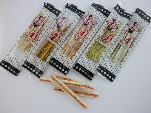 黒胡麻、白胡麻、唐辛子胡麻、わさび胡麻、梅胡麻をタラでサンドした人気商品です -