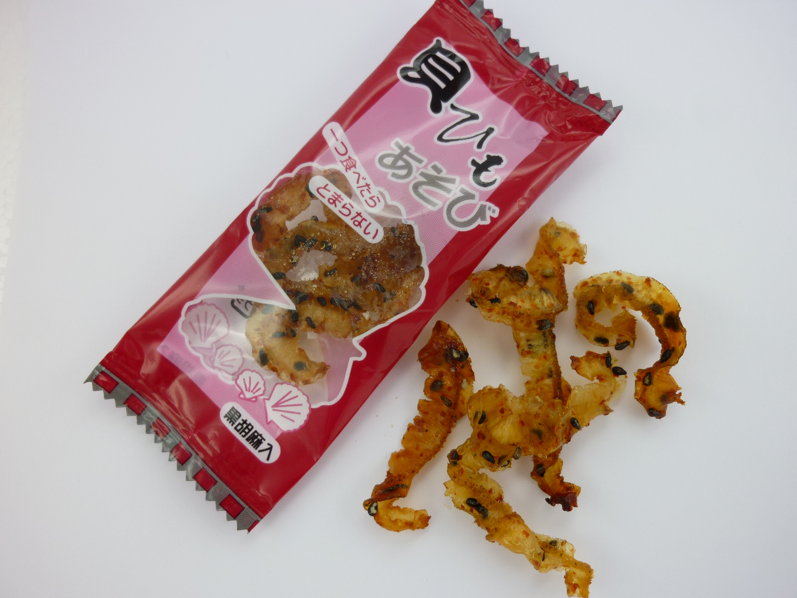 北海道産の貝ひもをこんがり焼き上げレッドペッパーと甘ダレで味付けしてその上に黒胡麻をふりかけました -